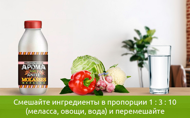 - Смешайте ингредиенты в пропорции 1 : 3 : 10 (меласса, овощи, вода) и перемешайте полученную массу.
