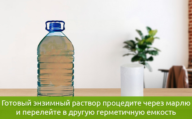 - Готовый энзимный раствор процедите через марлю или иной фильтр и перелейте в другую герметичную емкость. Теперь его можно понемногу добавлять при поливе в питательный раствор, а хранить его следует в темном месте, избегая попадания прямых солнечных лучей. Норма – 1 мл энзима на 1 литр воды для полива.