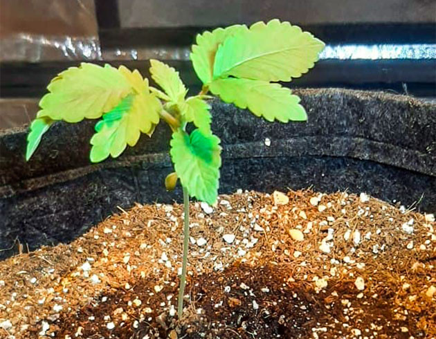 На третий день посадки, когда растишка уже набирала силы, к большому сожалению, из-за скачка электричества у меня перегорела ЭмПРА. И я остался только с одной лампой ДНаТ 400 Вт. Новая ЭмПРА шла до меня неделю, тем временем я попытался компенсировать недостаток света лампой LED 200 Вт. Полагаю, из-за этого рост растения замедлился. В дополнение к этому я начал кормить растение с первого дня (опрыскивал почву половинной дозой Plagron A+B cocos от рекомендованной производителем), и, скорее всего, это привело к искривлению листа.