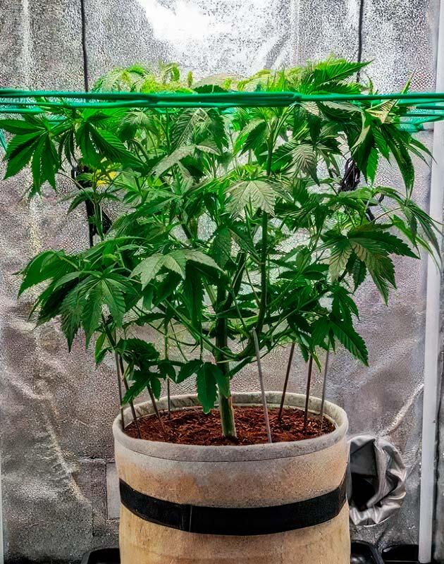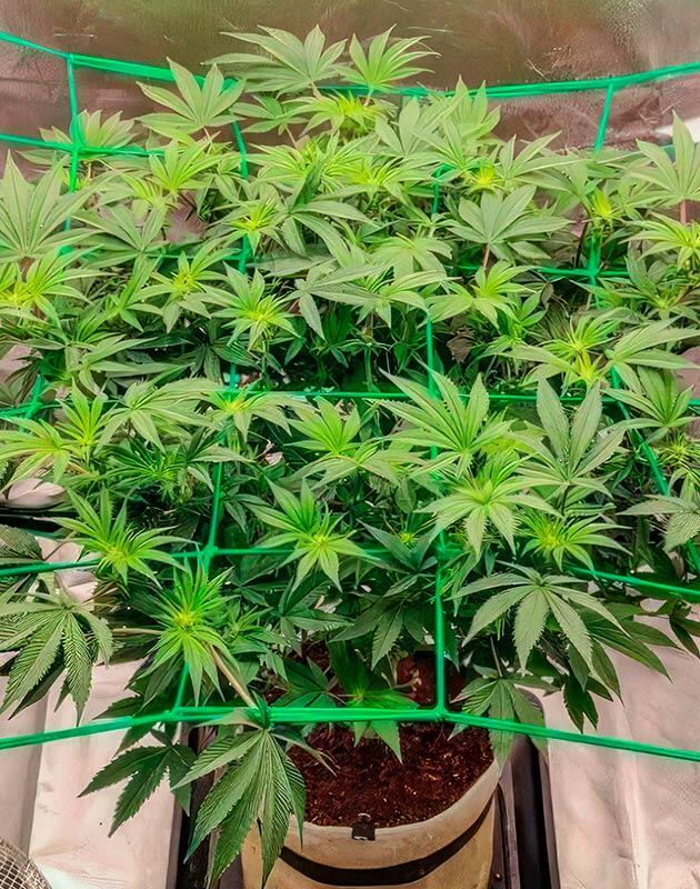 На этой неделе была проведена колоссальная работа. Я продолжил растягивать ветки в стороны при помощи колышков, а чтобы фиксировать их в горизонтальной плоскости, использовал сетку ScrOG. Также пришлось срезать несколько охапок крупных вееров, потому что они, словно зонты, закрывали нижние ярусы. Теперь куст выглядит куда более легко, а свет достает до самого горшка.