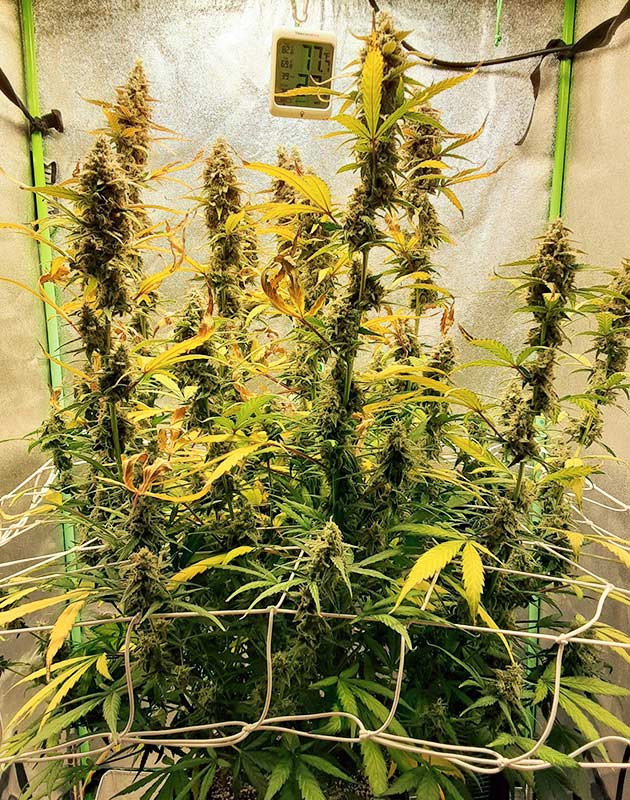Сказать, что я поражен тем, каким получился Black Jack Auto под 270 ваттами света, – это ничего не сказать. Таких огромных автоцветов я не то что не растил, я даже и подумать не мог, что из автика может получиться такой огромный куст. При этом у меня с ним было ровно ноль проблем. Он не пострадал ни от тренировок, ни от незначительного перекорма. Отличный, стабильный и очень крепкий куст с невероятным ароматом во время цветения. Я старательно проманикюрил все шишки и развесил их сушиться в боксе, снизив влажность до 20 %. Сохли они достаточно долго, почти неделю. Только после этого я взвесил их и получил 222 грамма сухого урожая!