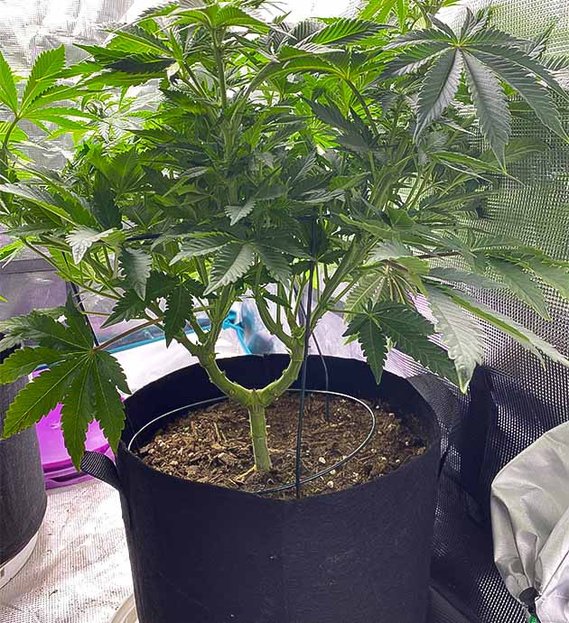 На 8-й неделе стебли развились достаточно для того, чтобы я смог убрать подпорки. Растение начинает активно вытягиваться в высоту и уже достигло 22 сантиметров. Через неделю листьев стало еще больше, а рост куста достиг 30 сантиметров. В конце девятой недели перешел на световой режим 18/6.