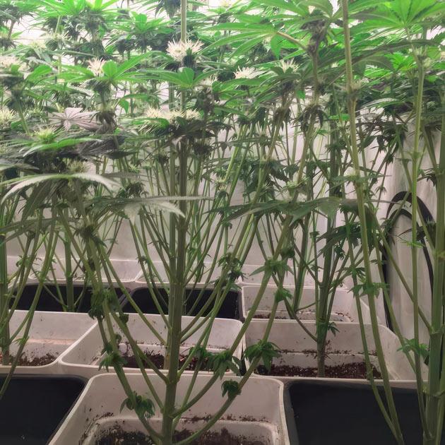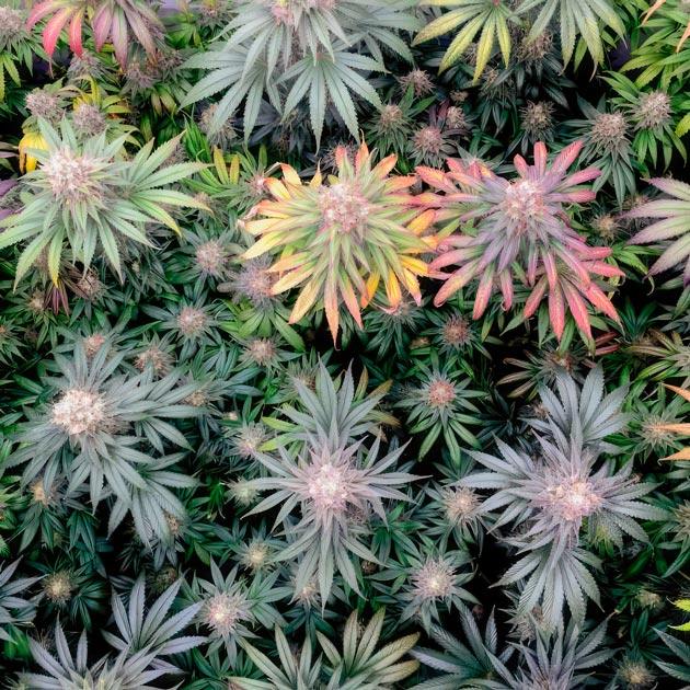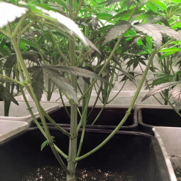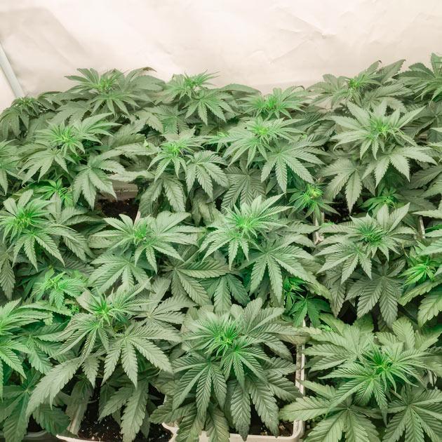 Цветение идет полным ходом. Кусты выглядят очень внушительно, крупные соцветия срастаются в одну сплошную мегашишку даже на таких ранних этапах. На листьях много «сахара», а запах становится все сильнее с каждым днем. Некоторые растения действительно имеют фиолетовый фенотип. Находясь в равных условиях, они уже ушли в сине-зеленый оттенок, пока другие остаются изумрудными.