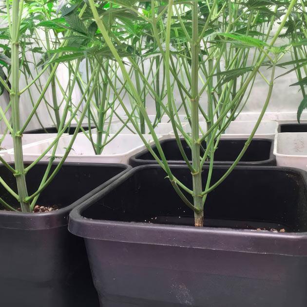 Похоже на то, что растяжка для Mac n’ Jack R1 подошла к концу. Всю неделю я занимался дефолиацией, и сейчас на кустах остались только редкие «вентиляторы» в верхней части кол. Вся остальная часть кроны зачищена, а свет и воздух хорошо проникают до самых горшков.