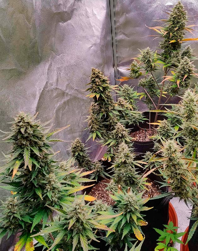На шестой неделе на одной из растишек появились признаки то ли ожога, то ли дефицита. Я сильно не заморачивался, так как в целом она выглядит хорошо, пострадали только несколько листьев. На всех кустах удалил значительную часть лопухов, они уже не нужны для нормального развития и набора массы шишек. Бошки, вообще, выглядят так, что хоть сейчас под нож пускай. Было бы здорово растить такой автоцвет, который созревает за 6 недель, не так ли? Но пока такое можно встретить только в описании некоторых сортов, на практике такого я не встречал (вы, думаю, тоже). Ну а что до Purple Punch OG XL Auto, то их рост устаканился в пределах 70 сантиметров, с увеличением шишек появился достаточно резкий запах, но из-за того, что в палатке есть другие сорта, что-то конкретное сказать не могу. На этой неделе растишки получали уже по три литра за раз, теперь была одна подкормка и два пролива чистой водой. Состав компота такой же, как и до этого, ничего не менял.