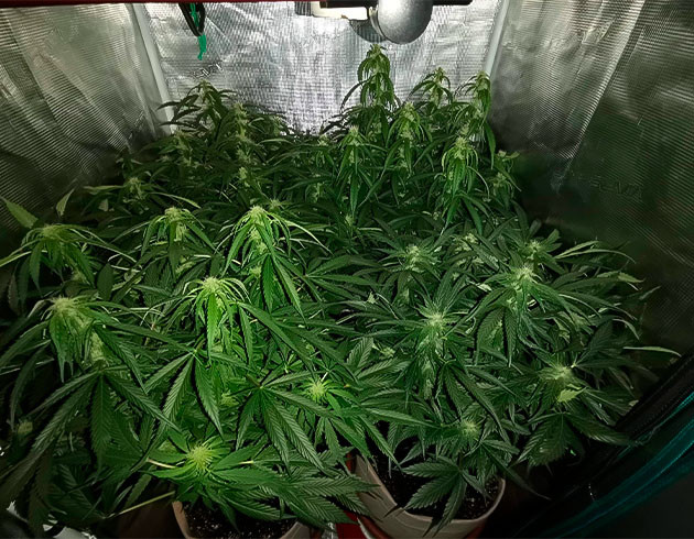 Девятая неделя, растишки перестали тянуться, разница в росте сохранилась плюс-минус на том же уровне. Шишки завязались полностью, покрываются трихомами, а аромат стал гораздо интенсивнее и теперь приобрел запах то ли солярки, то ли бензина, то ли какой-то концентрированной химии. Очень резкий и специфический, но как бы намекает на то, что плохая ганджа так вонять не может. Однако я заметил, что листва слишком уж темная, что может свидетельствовать о переизбытке питательных веществ. Поэтому немного уменьшил концентрацию базы Grow и Bloom до 2 мл/л, Micro и Big Bud оставил по 3 мл/л. Разовый полив 1,5 литра, 3 раза в неделю.