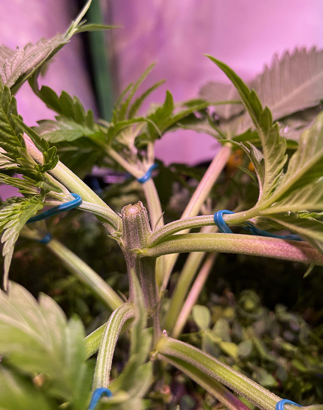С начала седьмой недели свет выставлен на режим «Цветение», 12/12. Обе девочки быстро заполнили все свободное пространство, разрослись по сеткам и выглядели отлично. В конце недели я обнаружил, что одна из ветвей на большей растишке надломлена. Возможно, повредил её во время переезда. Замотал изолентой, и за неделю она нарастила там приличную мозоль. Дополнительно подпер ветку, чтобы она не сломалась до конца.