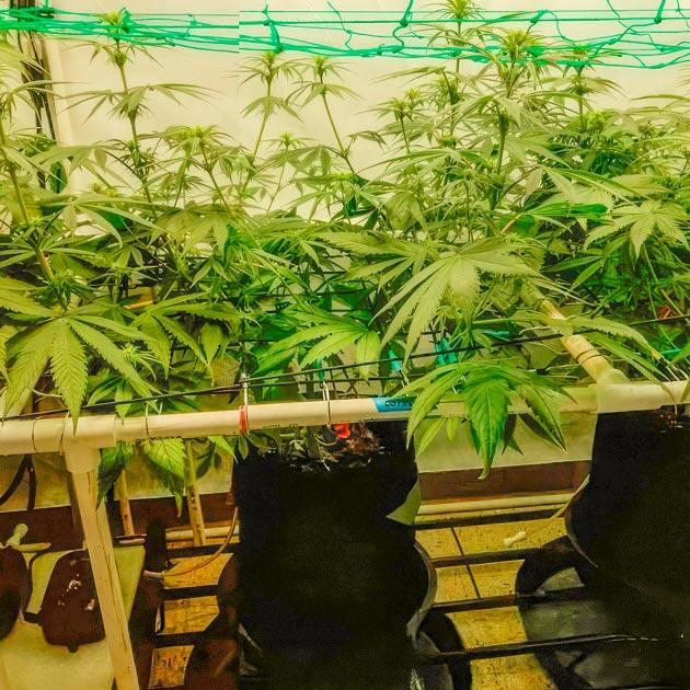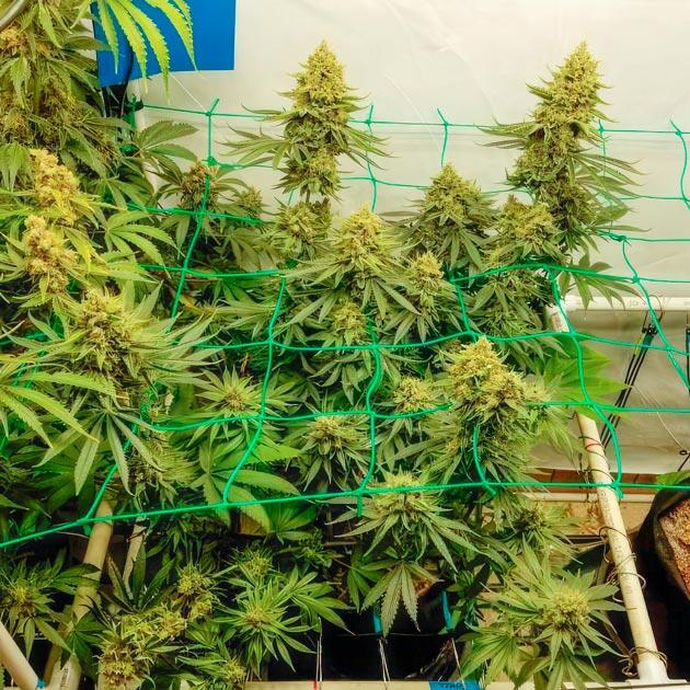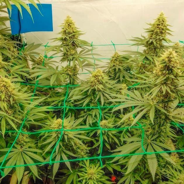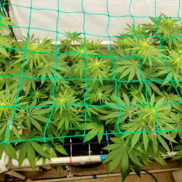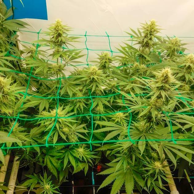 Перевод таймера на 11-часовой световой день и правда подтолкнул куст показать все, на что способна эта генетика, да еще и как можно скорее. Всего за неделю рост удвоился, а все сформировавшиеся колы устремились ввысь поближе к свету. На верхнем уровне начал образовываться некий хаос, так как соседствующие растения находятся достаточно близко друг к другу, но это ожидаемый исход, и на такой случай у меня припасена еще одна сетка. Она одновременно служит рационализатором пространства и поддержкой кол на этапе цветения. Она не эластичная, как первая, да и устанавливаю повыше, чтобы дать больше стабильности.
