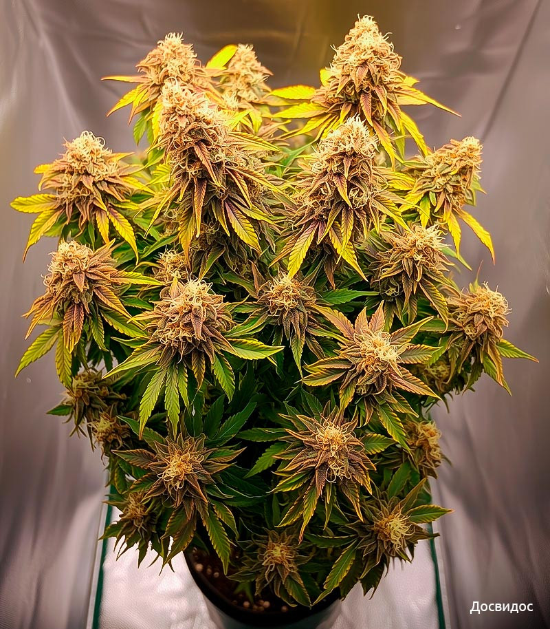 Кусты развиваются компактными и крепкими - в среднем от 60 до 150 см в высоту. Это позволяет использовать Dos-Vi-Dos Auto как в индоре с ограниченным пространством, так и в аутдоре: хоть в партизанском стиле, хоть в горшках, хоть в диких условиях. Несмотря на скромные размеры, структура куста ветвистая, с короткими междоузлиями и широкими листьями. Это типичная Индика с массивными шишками, которые к моменту созревания буквально сочаться смолой.