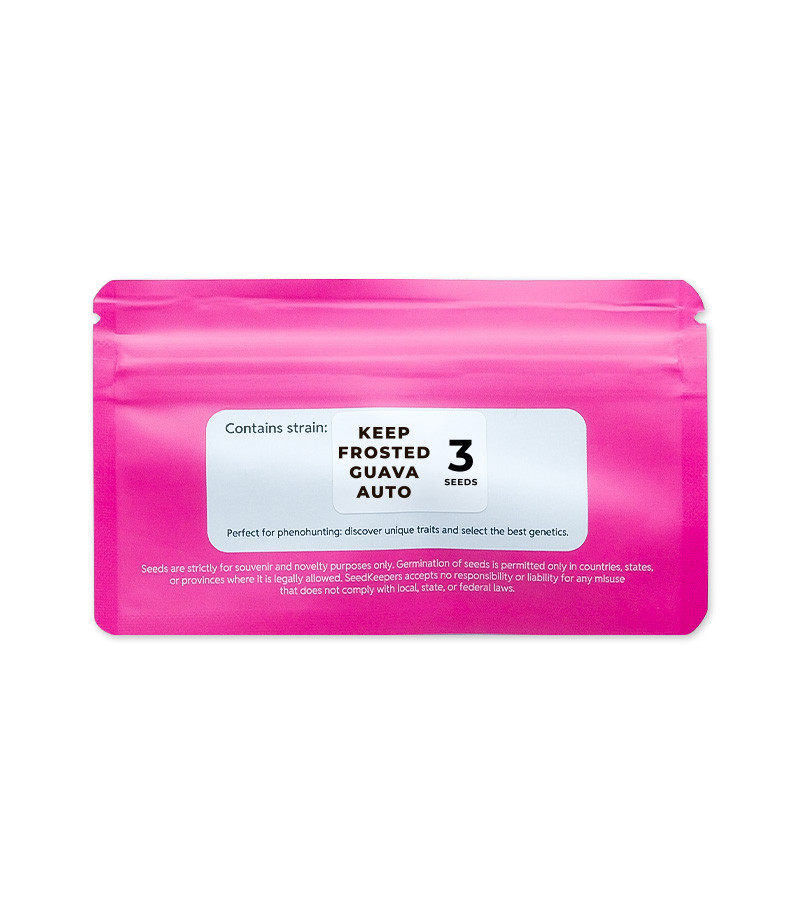Автофеминизированный сорт каннабиса Keep Frosted Guava Auto от бренда Seedkeepers – это сладкий и урожайный гибрид с преобладанием индики. Его генетическая история достаточно интересна. По сути, это кросс экзотического гибрида Guava и морозного сорта Frosted Skywalker, скрещенный с особой разновидностью дикой конопли Keepers Ruderalis, придавшей растению автоцветущие свойства.