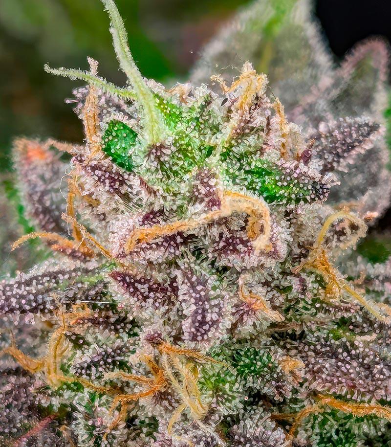 Каннабис Papaya Frosting радует не только вкусом, но и своим прилежным характером. Это сорт, который крайне редко болеет и благодарно отзывается на заботу. Рост кустов составляет около 100-110 см в индоре и до 1,8 м на улице. Крона с мощными ветвями и плотной, почти шаровидной формы. Листва густая, темно-зеленая, с фиолетовыми прожилками, а шишки крупные, мясистые, буквально облеплены золотисто-белыми трихомами, из-за которых растение и получило свое «морозное» название.