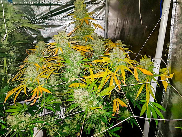 На цветение решил переводить тогда, когда растение достигнет высоты в 50 см, и случилось это на 7 неделе. В 8 недель установил импровизированную сетку. Еще за пару недель куст дорос уже до 70 см. С 11 недели стал добавлять бустер цветения, и масса шишек стала активно нарастать. Вообще сорт прекрасно реагирует на все – на основной питательный комплекс, на свет, на бустеры. Мне даже пришлось сменить систему основного питания, так как старые удобрения закончились, и растиха отлично это перенесла.